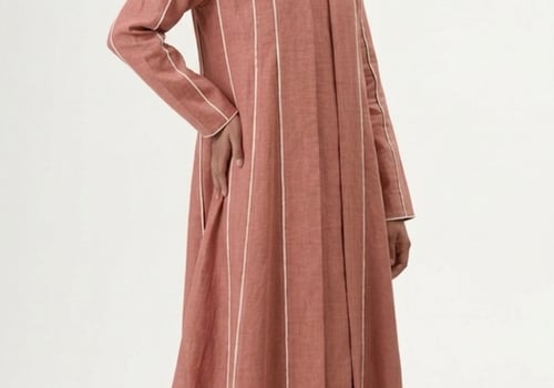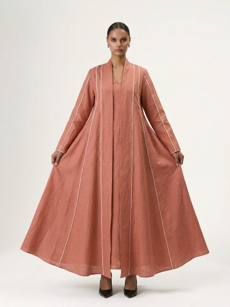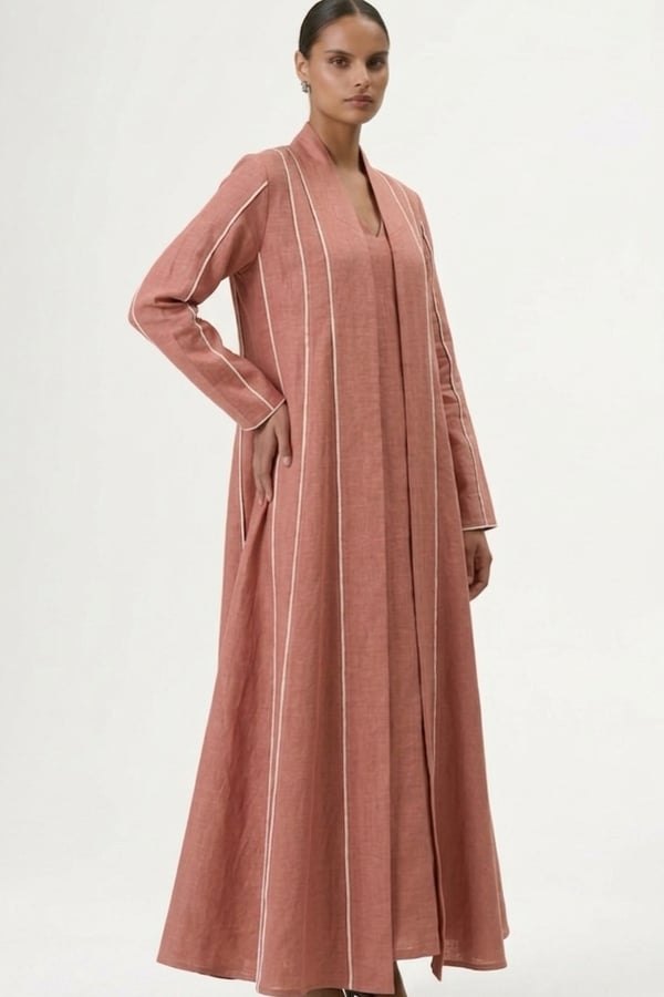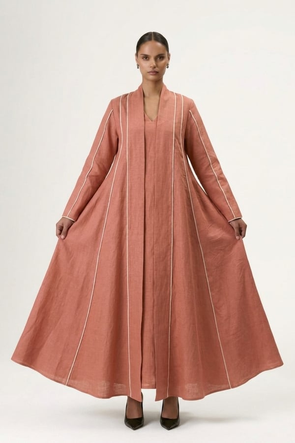 Wide cloche-cut abaya with vertical white lines and attached inner dress for a complete, elegant look