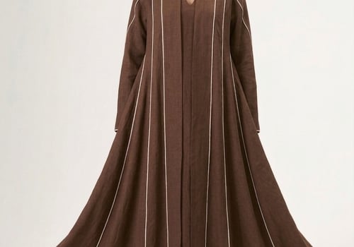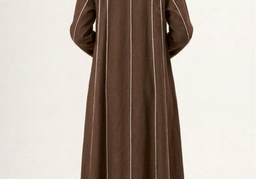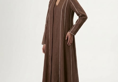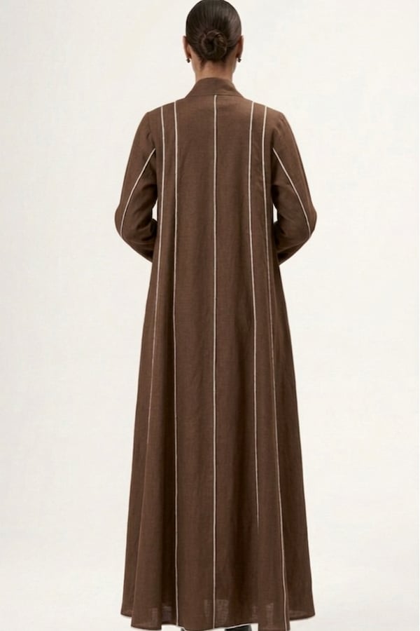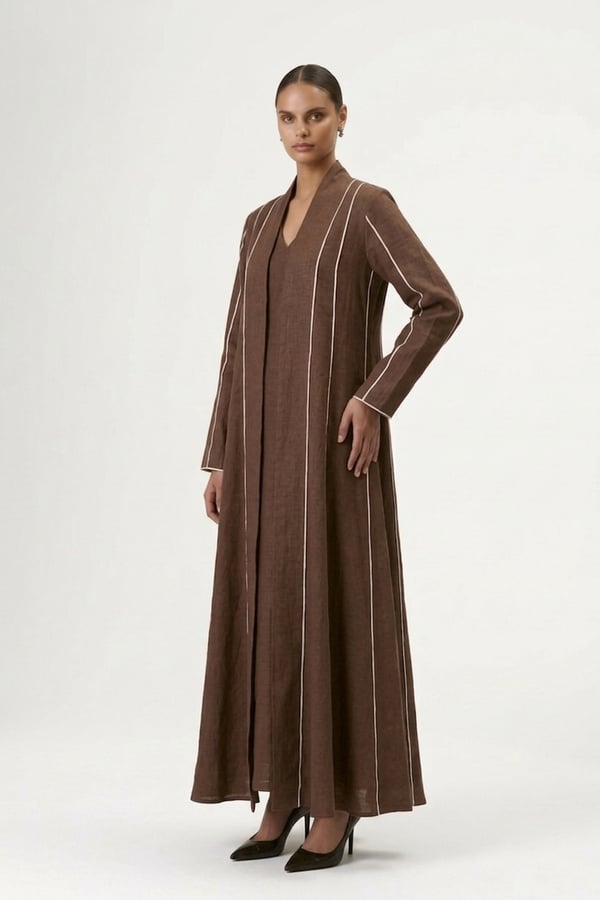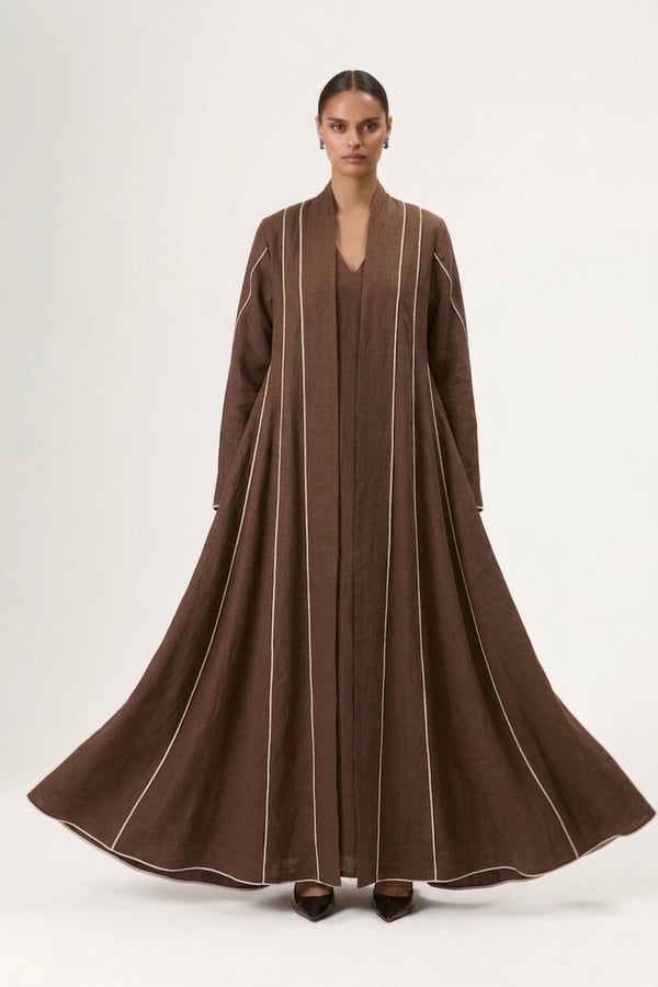 Wide cloche-cut abaya with vertical white lines and attached inner dress for a complete, elegant look