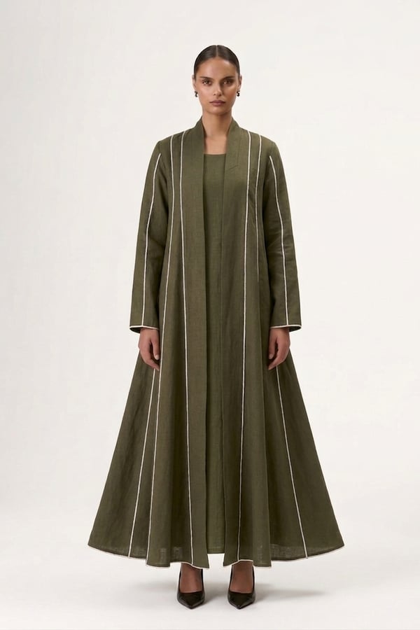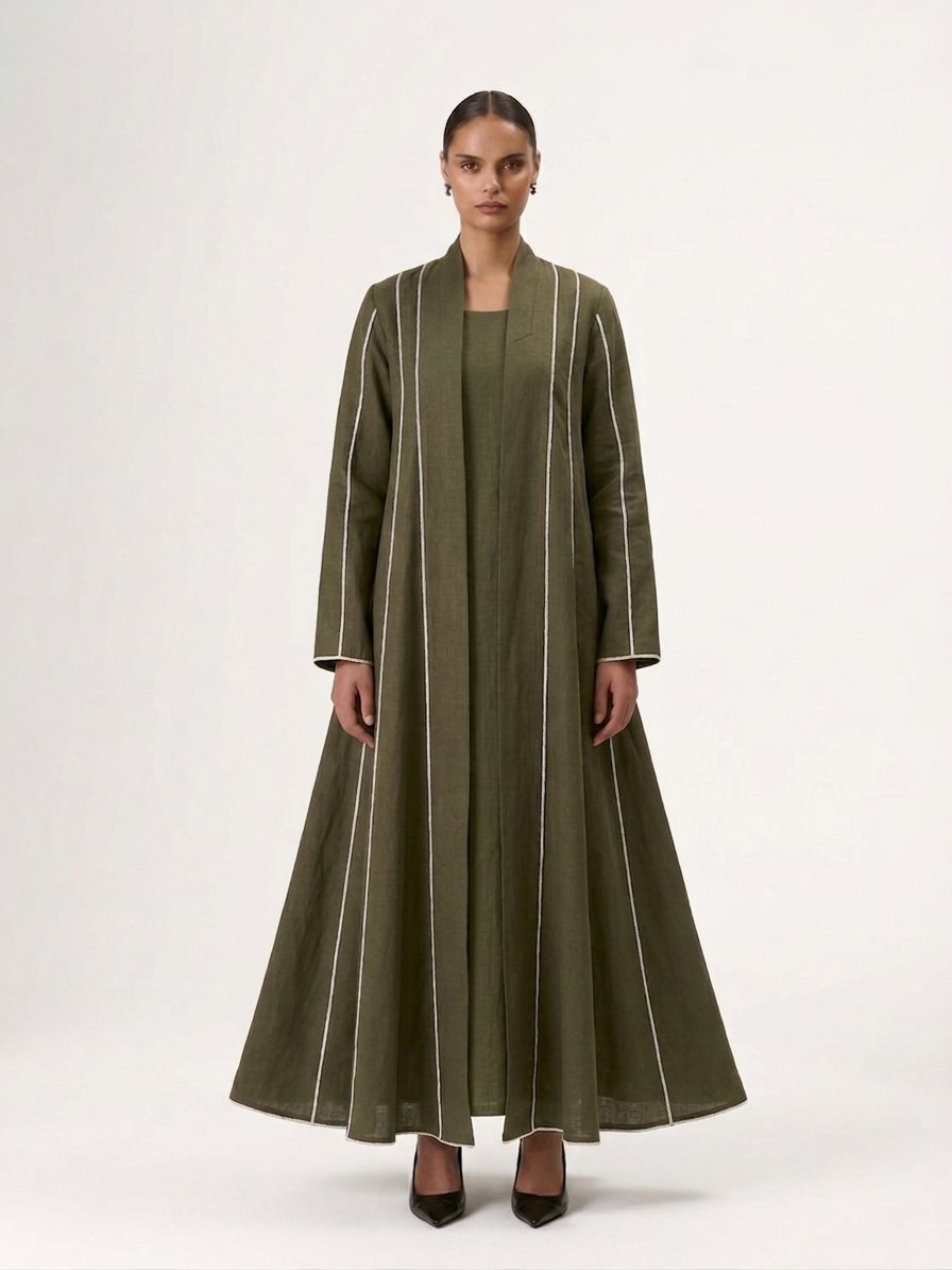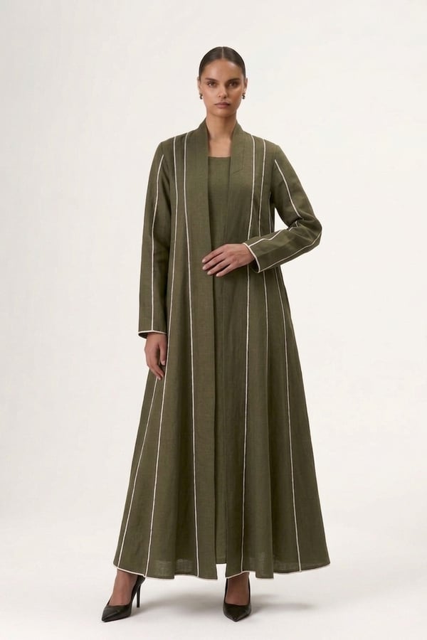 Wide cloche-cut abaya with vertical white lines and attached inner dress for a complete, elegant look