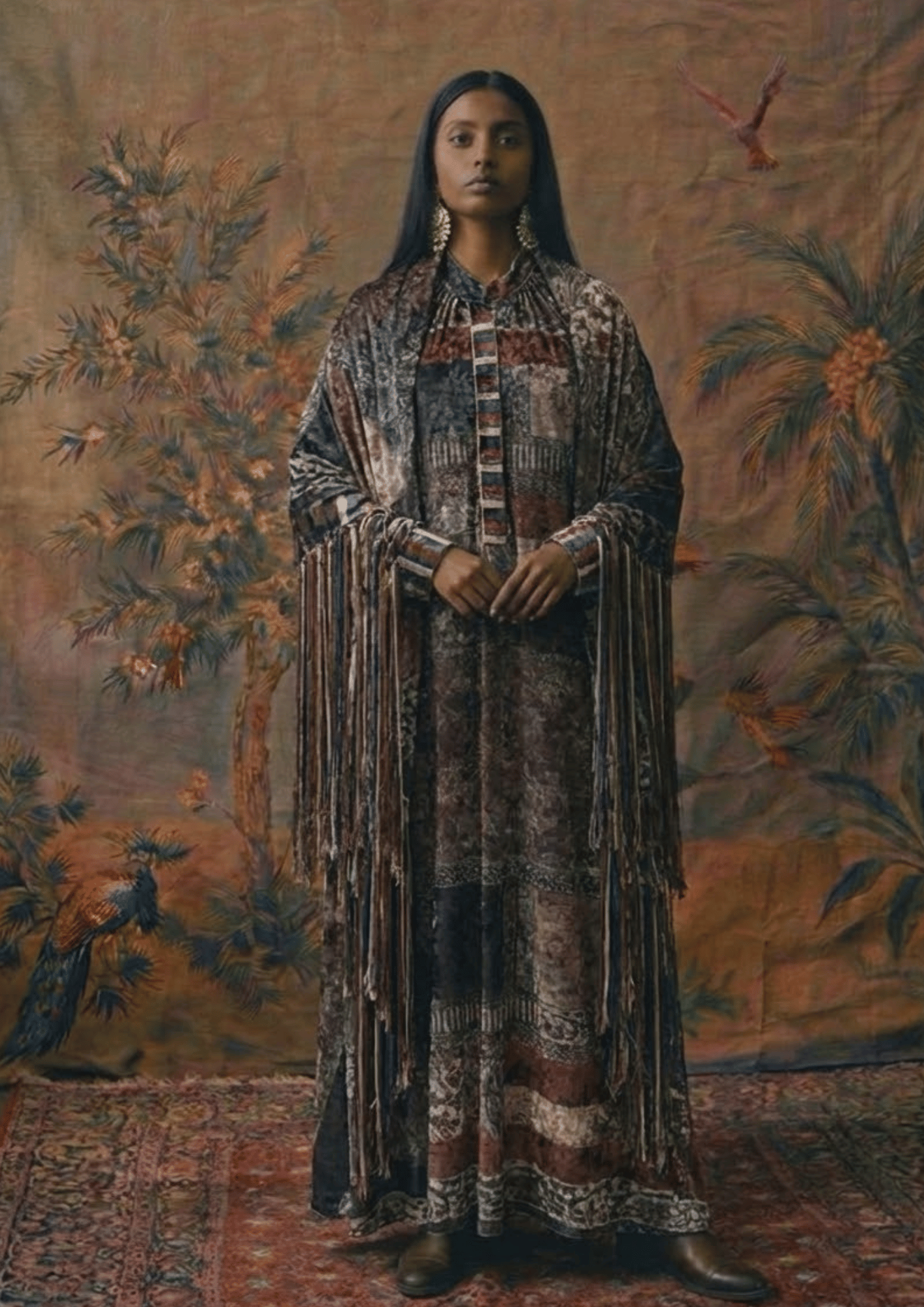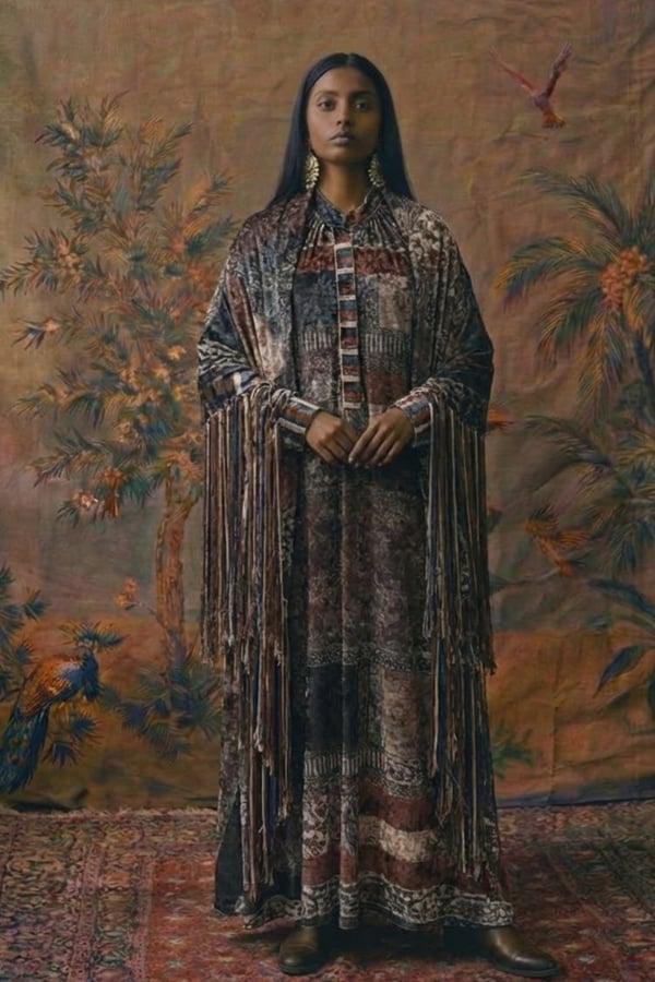 Two pieces, infinite elegance. A velvet dress & fringed shawl set .