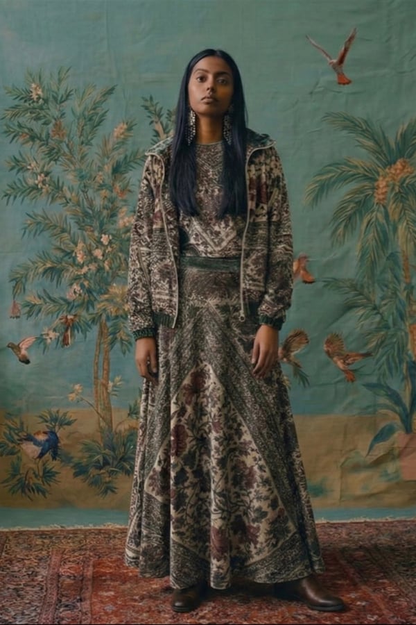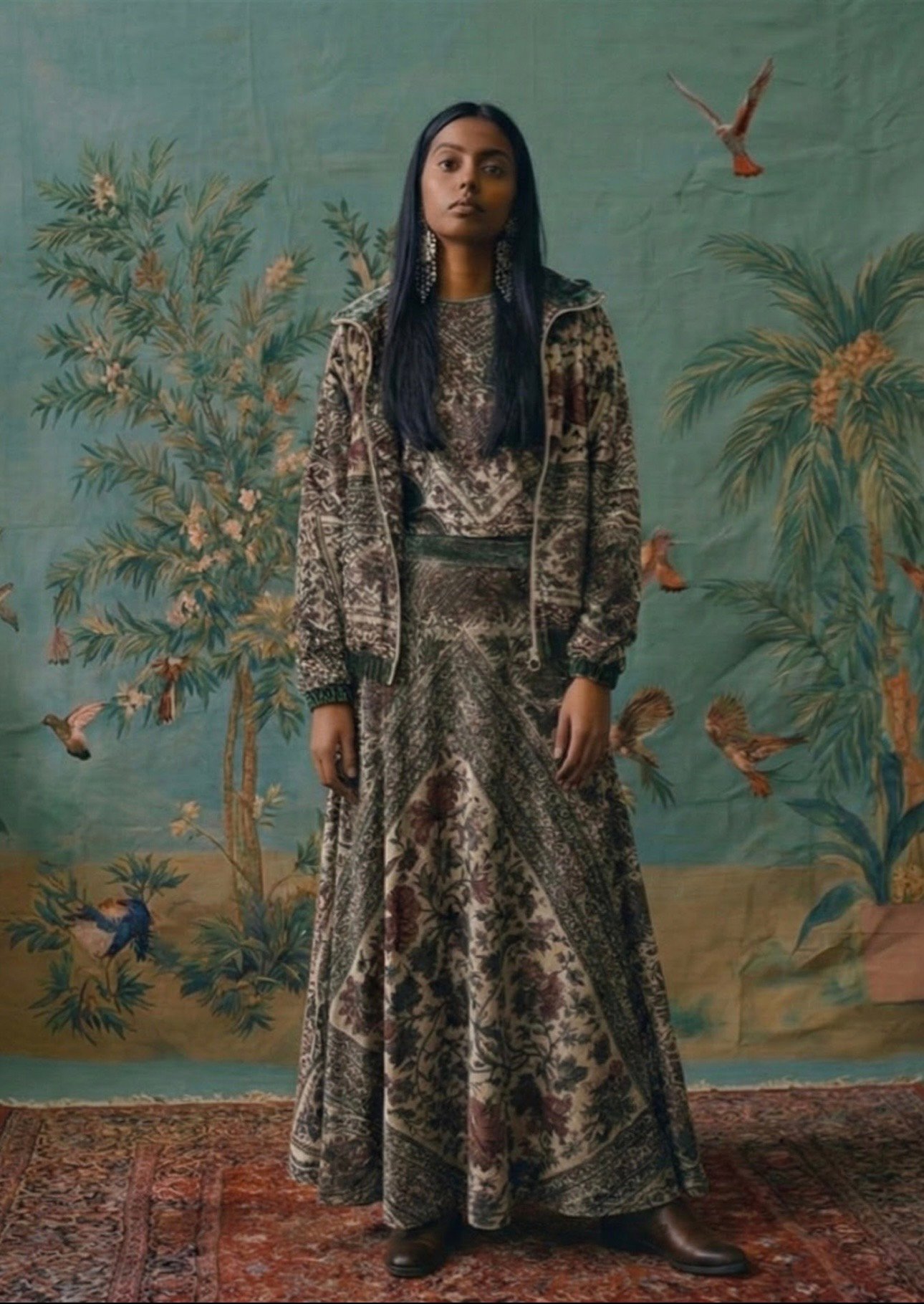 Luxurious 3-piece velvet featuring an exclusive geometric heritage print. Includes a bomber jacket, top , and skirt.