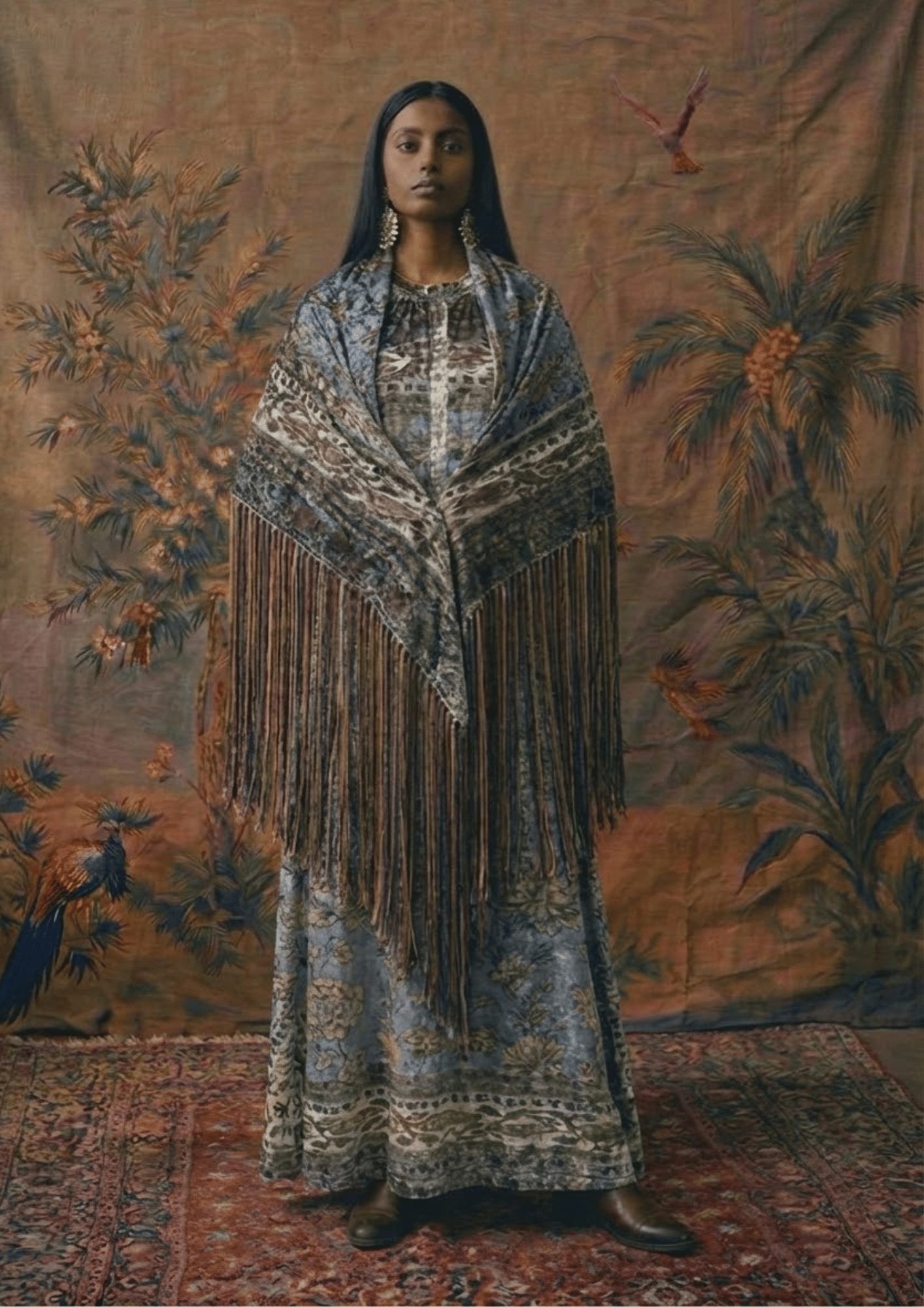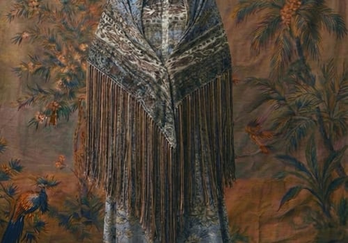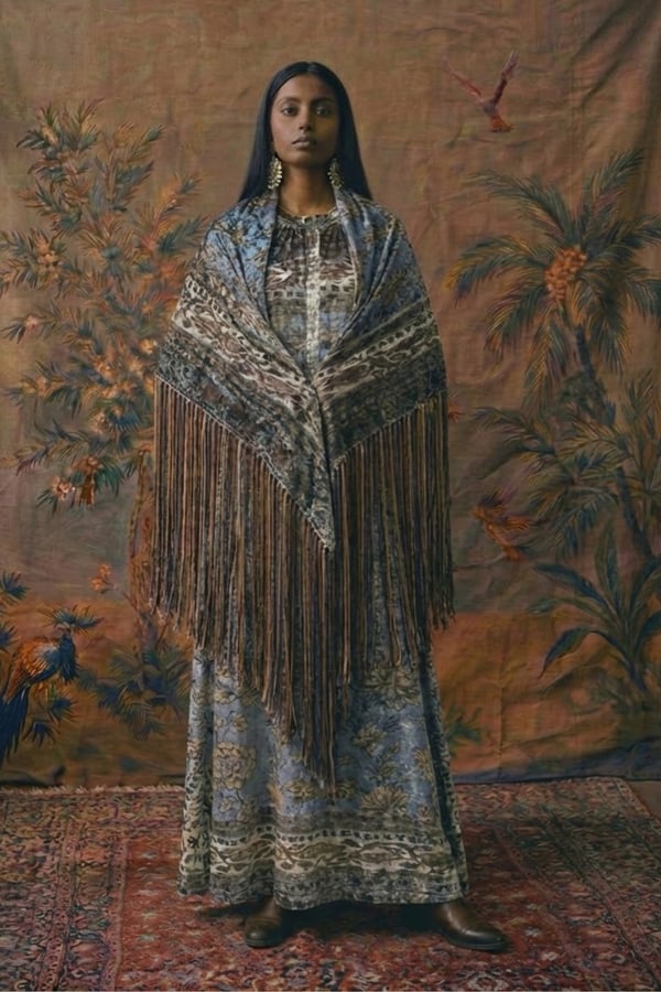 Two pieces, infinite elegance. A velvet dress & fringed shawl set .